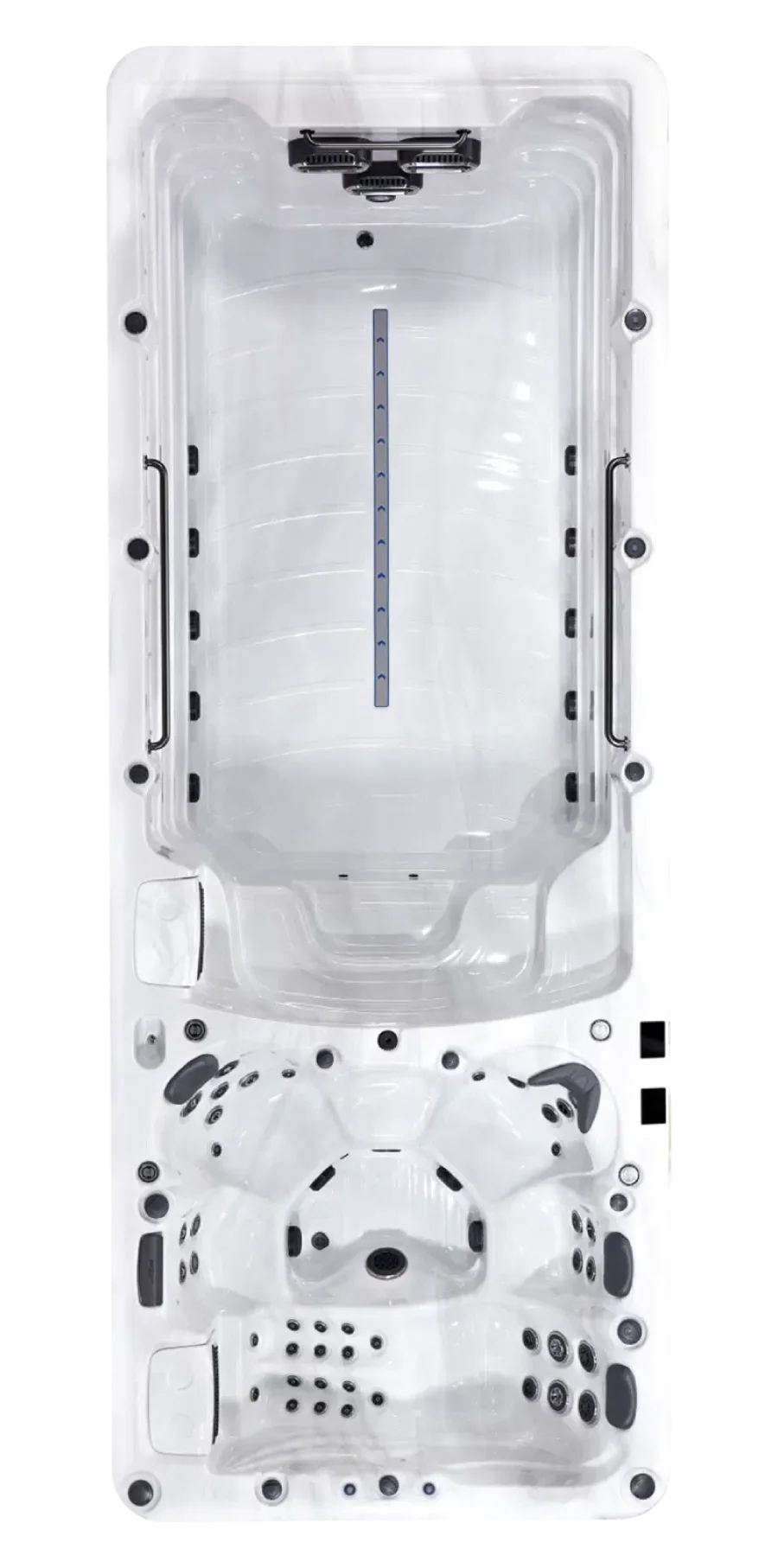 The Helios Swim Spa is a full split of the swim spa and hot tub sections, allowing complete temperature control of both. This allows for a warmer, soothing hydrotherapy experience in the spa end, whilst maintaining a slightly cooler temperature in the swim end for exercise.