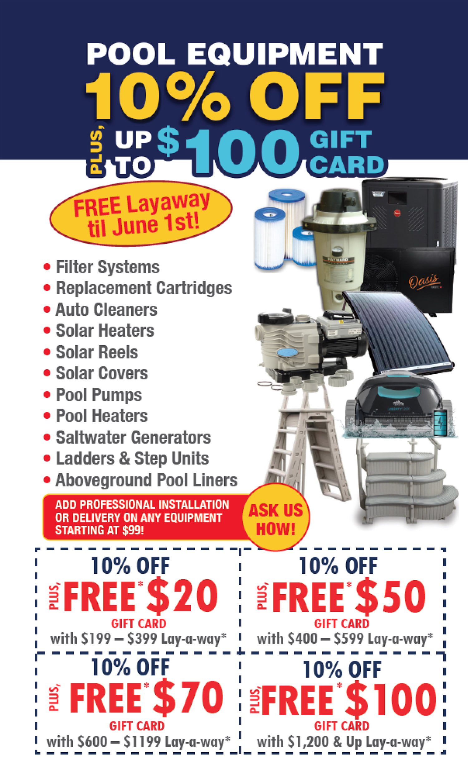 In-Store Promotions and Coupons Want to use a deal or coupon in our stores? Just show from your phone, or you can just mention our website deals! No need to waste ink and paper to print! In-store only! While supplies last! Visit us today at any of our 10 locations. Find Your New Pool Liner Here Find Your New Hot Tub Here Find Your New Pool Here