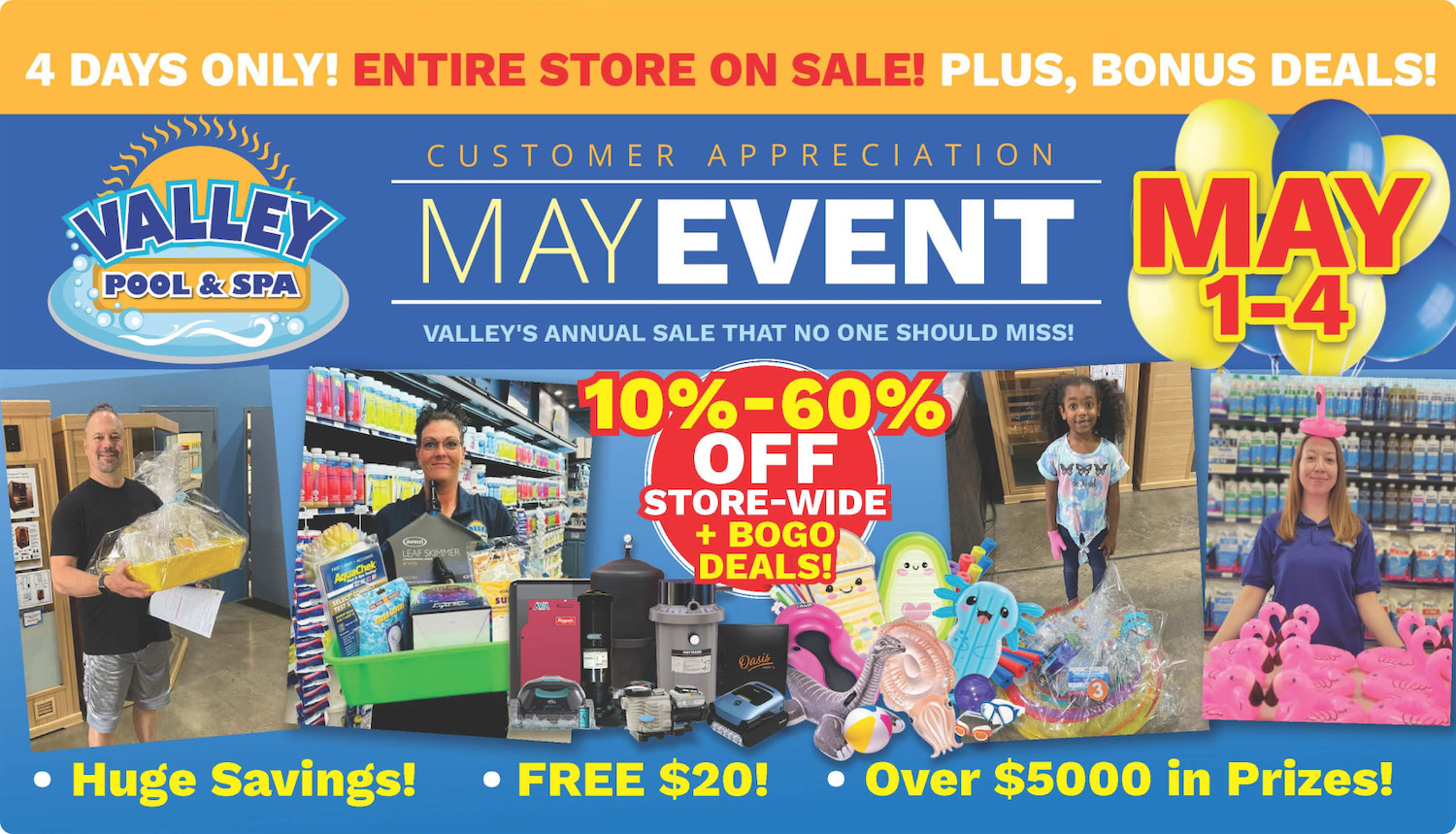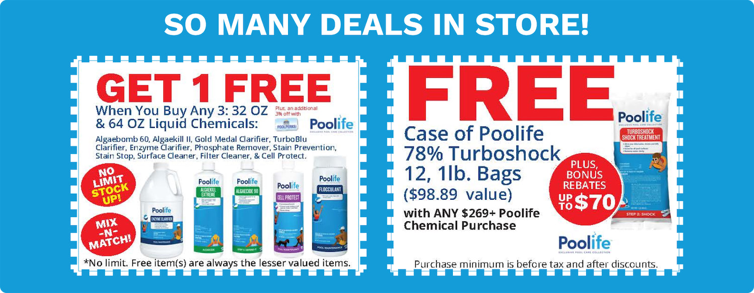 In-Store Promotions and Coupons Want to use a deal or coupon in our stores? Just show from your phone, or you can just mention our website deals! No need to waste ink and paper to print! In-store only! While supplies last! Visit us today at any of our 10 locations. Find Your New Pool Liner Here Find Your New Hot Tub Here Find Your New Pool Here